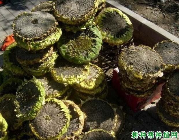 当葵盘呈黄色、茎秆及中上部叶片开始褪绿变黄时及时进行人工收获。收获的子粒含水量较高,要及时晾晒,摊场要薄,翻场要勤,防止霉变损失。