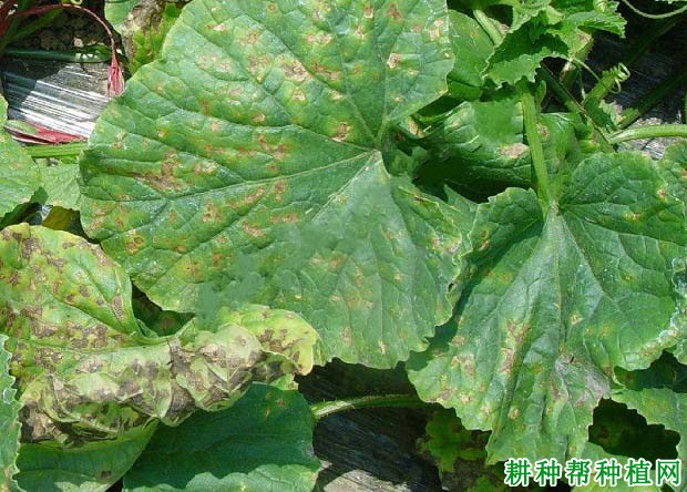 1、叶片受害症状:发病初期叶片上产生小黄点,褪绿色,后扩展成圆形至椭圆形病斑,病斑褐色,中央灰白色,边缘深褐色至紫褐色,微微隆起,外缘油渍状。后期中部有稀疏霉层。病斑大小约0.1~0.2毫米,病叶上斑点数目很多。严重时叶片卷曲、枯死,病株呈红褐色。此病在座瓜后期开始出现,通常在中上部叶片发生。