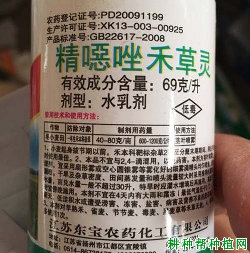 骠马对高等动物低毒。原药小鼠急性口服LD50>5000毫克/千克。大鼠经皮LD50原药和制剂分别>2000、4000毫克/千克。对家兔皮肤有刺激作用,对兔眼暴露1分钟无刺激性,但暴露24小时有中度刺激作用。狗两年饲喂无作用剂量为15毫克/千克,在试验条件下未见致畸、致突变、致癌作用。对鱼类有害,鲤鱼和蓝鳃翻车鱼96小时LC50分别为4.3和4.2毫克/升。对鸟类和蜜蜂安全。有效成分乙基苯氧丙酸能被植物绿色部分吸收,并传导至根、茎、叶基的生长点。并迅速转变为苯氧丙酸游离酸,抑制脂肪酸生物合成,阻碍杂草生长点的细胞膜形成,类囊体膜减少,造成叶绿素含量降低。并使杂草茎组织中可溶性糖及游离氨基酸增加,代谢紊乱,导致杂草死亡;小麦等谷物能够将苯氧丙酸分解成无毒代谢物。