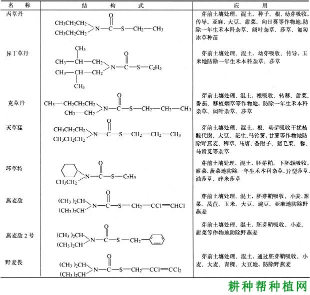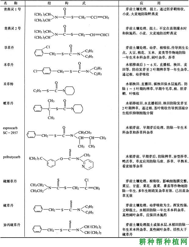 ②二硫代氨基甲酸酯。氨基甲酸中两个氧被硫置换的酯类。应用中关键问题是防挥发。喷药后应及时混拌入土中5~8厘米或水田保水层施药,大多数品种作播前土壤处理防除一年生禾本科杂草及某些阔叶杂草。